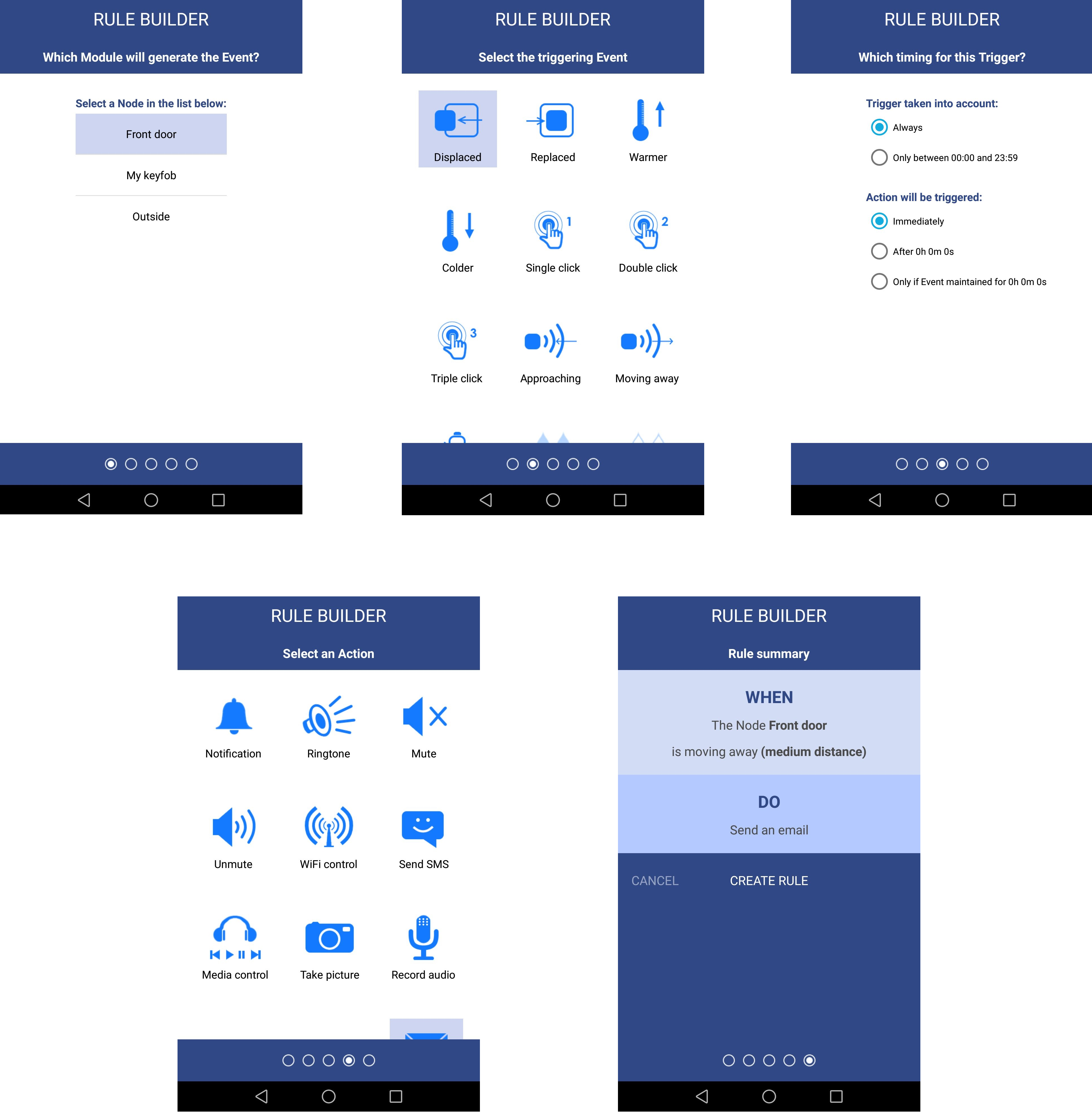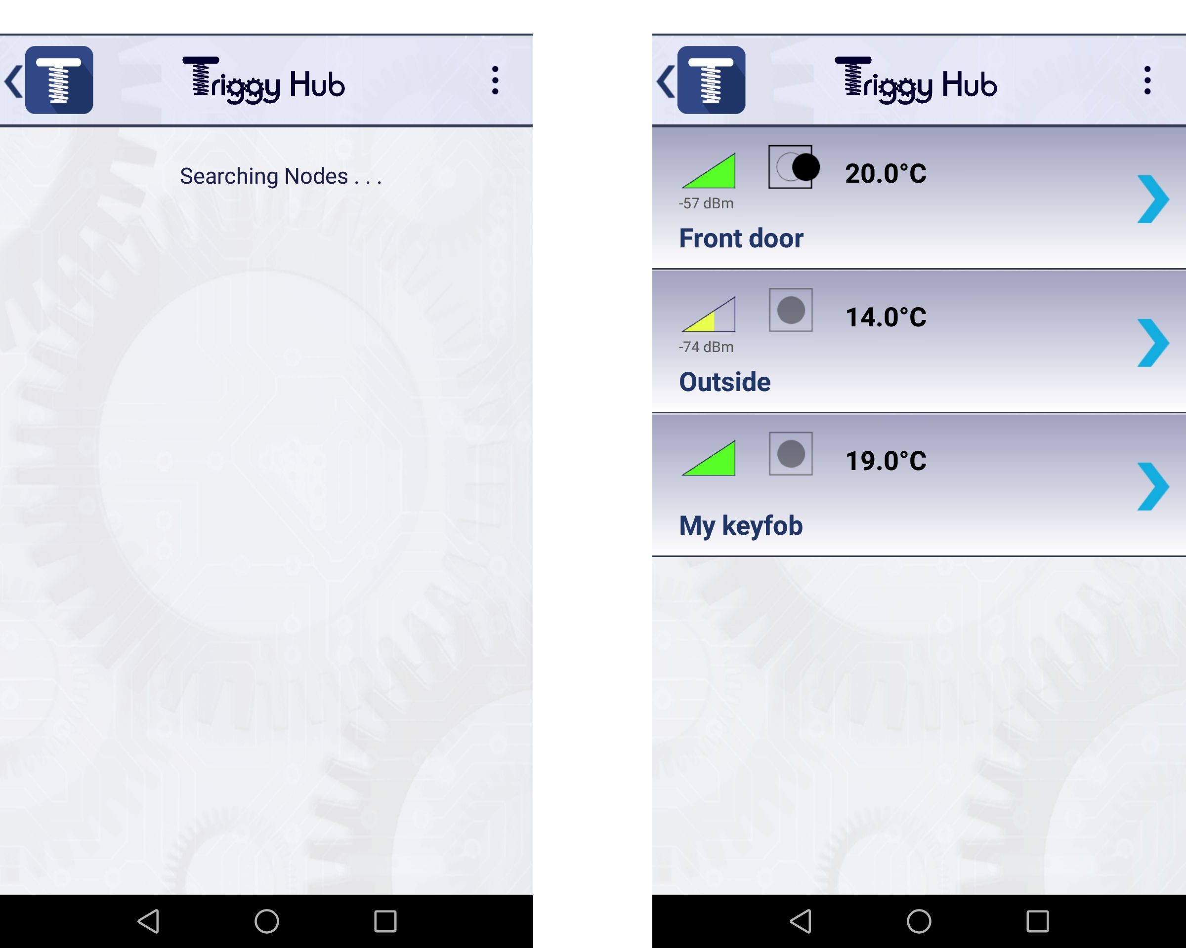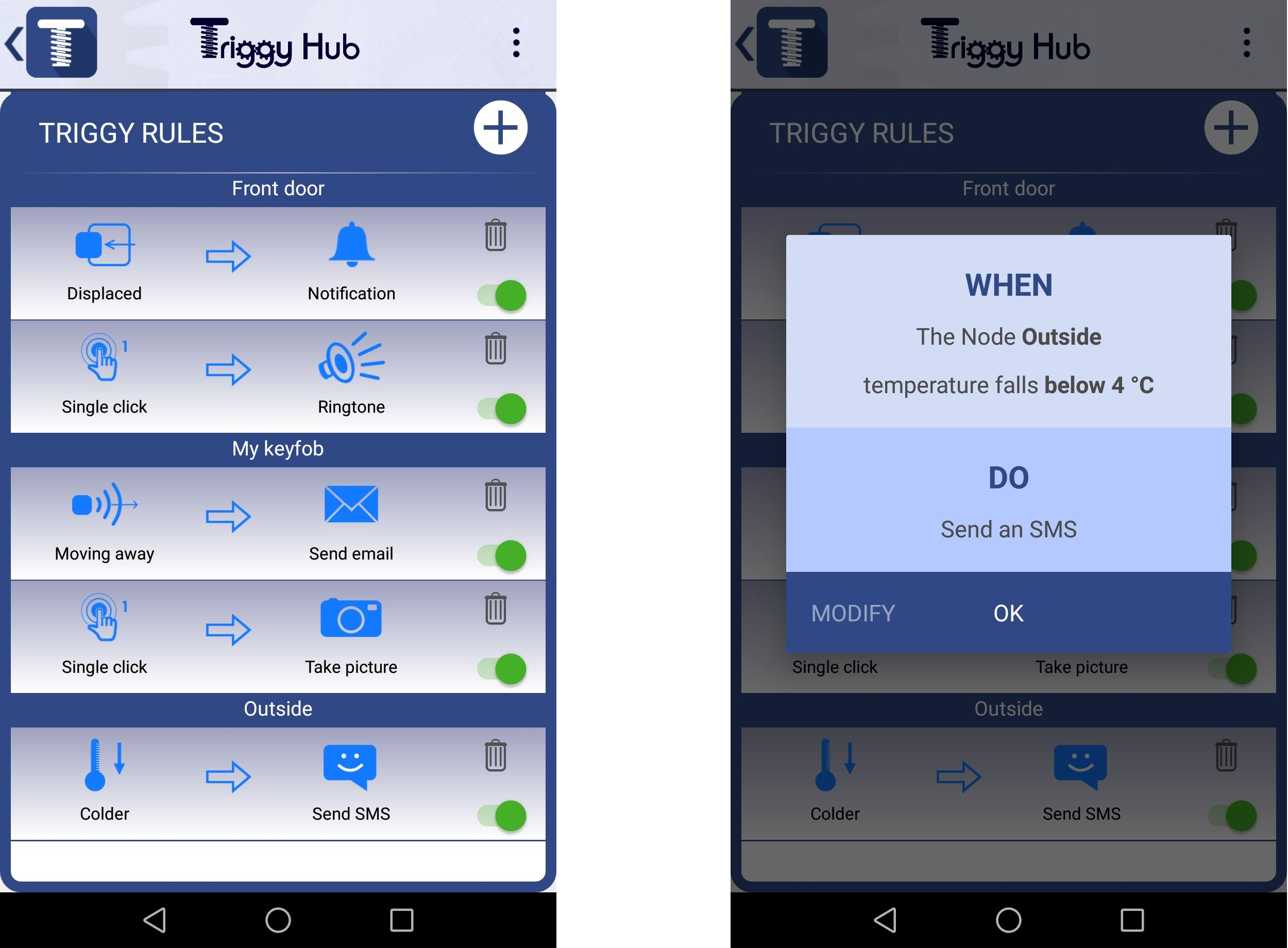 Basically, the goal of Triggy is to provide a solution to many situations, using a small board (the Triggy Node or T-Node) as a smartphone or tablet companion. The T-Nodes sense the environment and automatically trigger actions based on physical events, paving the way to numerous usage scenarios. A Triggy Node can detect an event such as: this door is opening, the temperature in the fridge goes above x degrees, someone pushed the button, etc... Then a fully customizable rule allows to decide what to do: generate a notification on the phone, play a ringtone, or a lot more. An advantage over other solutions is that no external server or account creation is required.