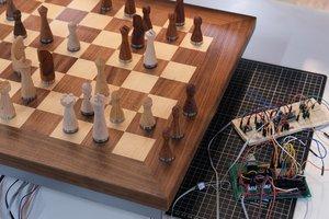 After that, it was a matter of attaching the arm and calibrating the letters. Each letter is stored internally as a combination of arm and planchette servo positions. I just did this by hand, tweaking positions until I got good alignment for each letter. I could probably have calculated them all based on the distance and angle of the arm and planchette, but I think that would have taken longer than just doing it manually. (To be really cool I'd have set multiple different position pairs for each letter and chosen from them at random to make the motion more natural-feeling, but I didn't have the patience.)