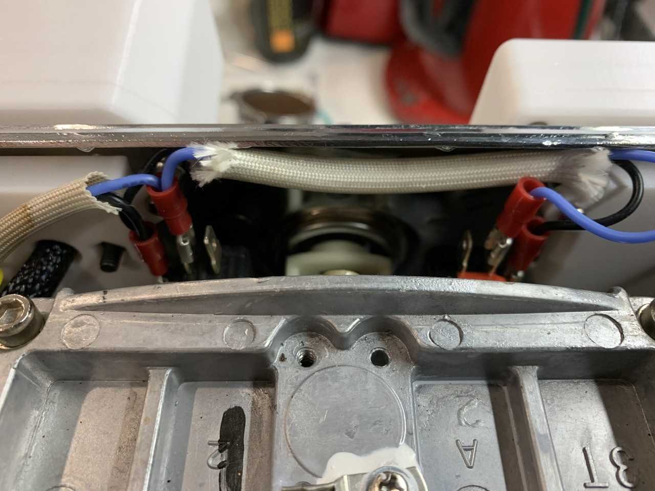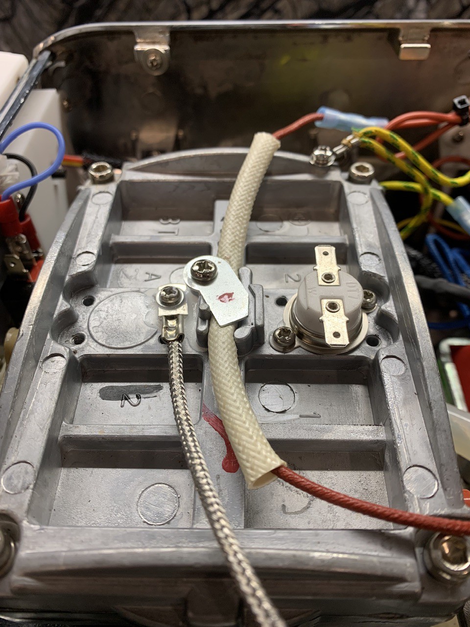 Above is a picture of the boiler. On the left is the thermistor with the metal braided cable. In the middle is the thermal cutout fuse with the brown wires. On the right is one of the original thermal switches. This is not used by the Gaggiuino system and is completely disconnected.