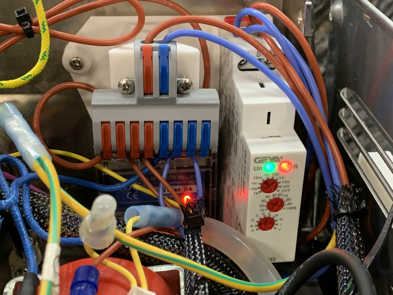 In this picture you can see the relay inside the coffee machine. It's mounted to a 3D-printed frame that also mounts the solid-state relay and a WAGO-style terminal block to distribute power. This in-turn is mounted to the screw bosses that were used to mount the original control PCB to the machine's chassis
