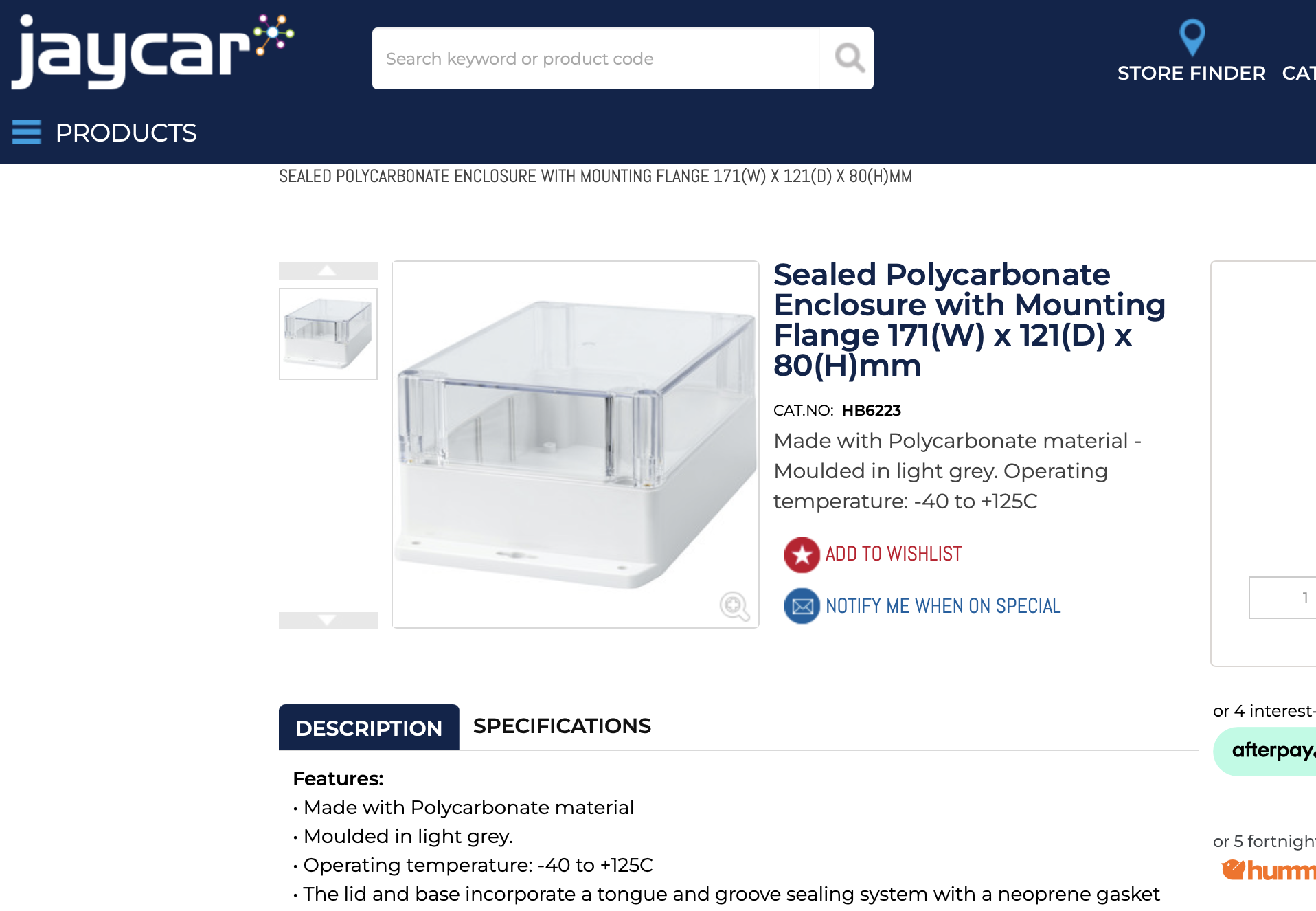 Here's the enclosure that I used: https://www.jaycar.com.au/sealed-polycarbonate-enclosure-with-mounting-flange-171-w-x-121-d-x-80-h-mm/p/HB6223. This comes from a local Australian supplier, so I'm not sure how available it will be to everyone else. I would actually recommend editing the OpenSCAD file to match whatever enclosure you can find