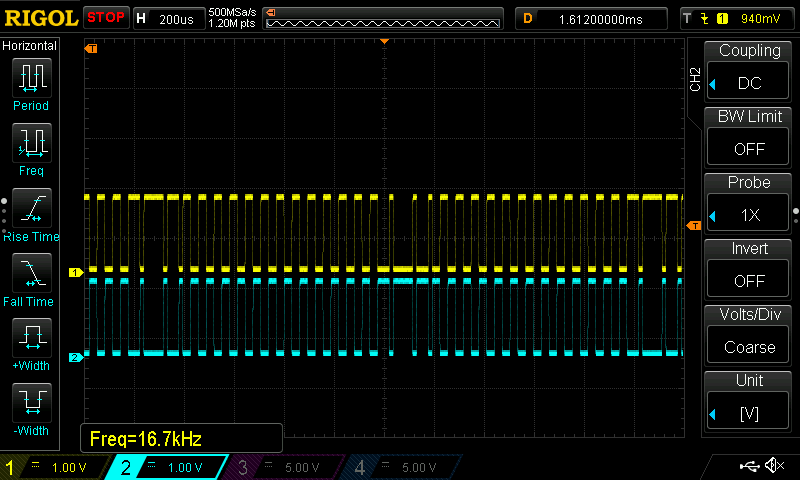 The high part of the signal is sloped. My theory about that is there is a bit of overshoot on the excitation signals. This is normal since I soldered a bunch of signals.
