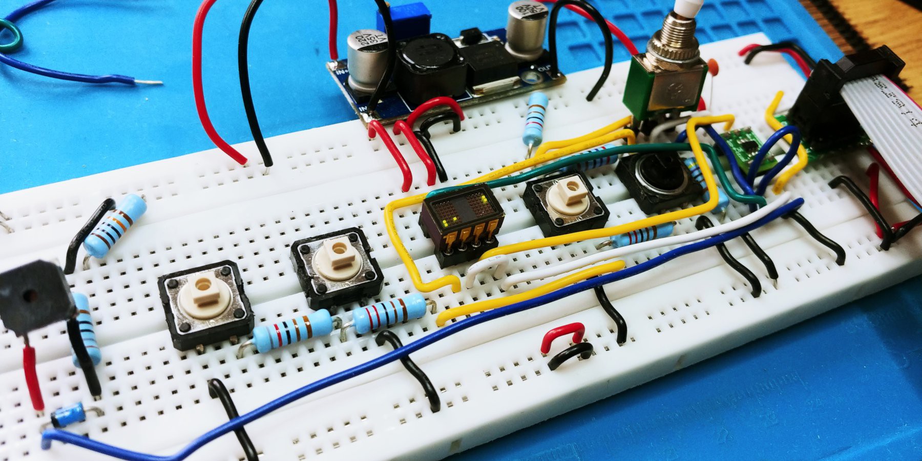 And this breadboard also doubles as a programming rig for the cartridges. There is a 12V boost converter with a switch, which is required to program an Attiny10 when the reset function on the pin PB3 is disabled.