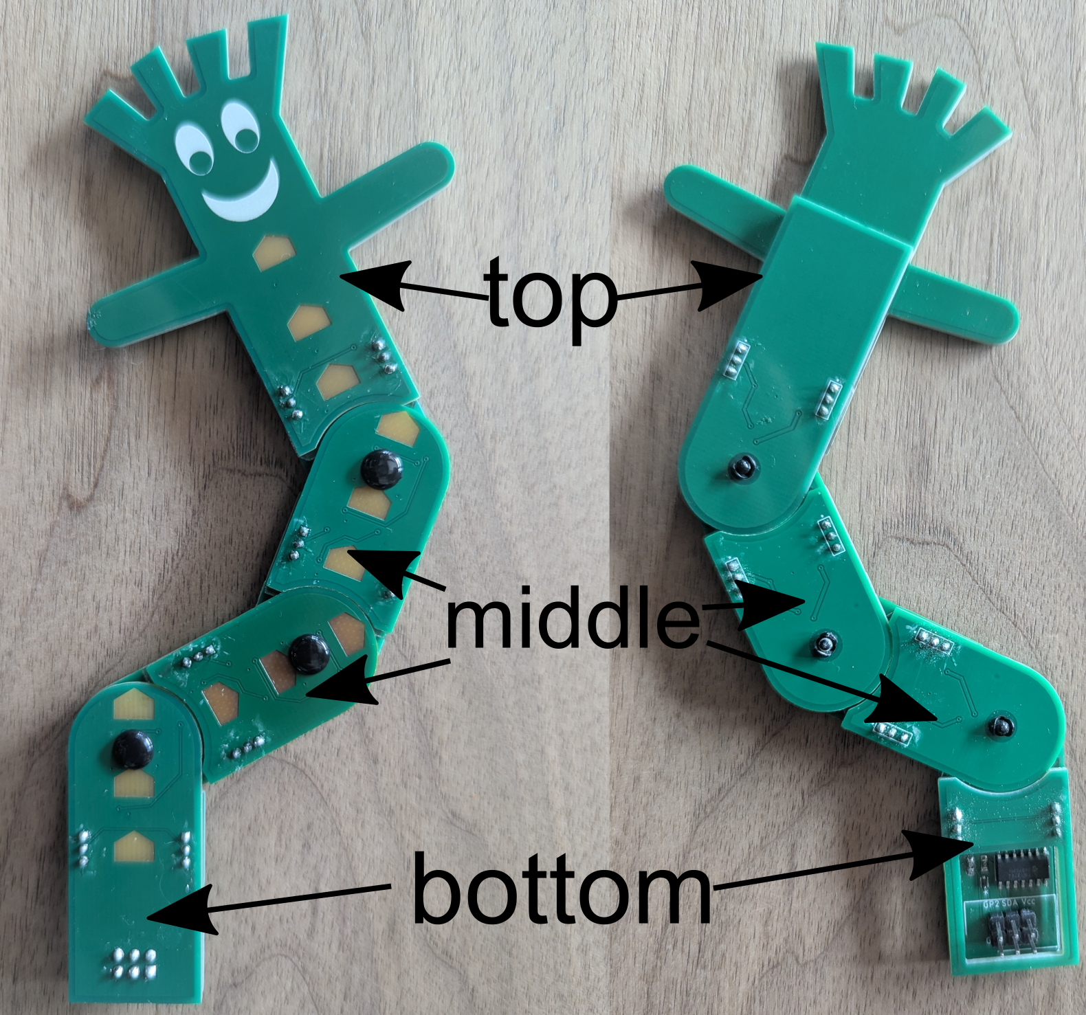 I built a successful proof-of-concept a few years back: https://github.com/geekmomprojects/ArticulatedPCBs, but wanted to try to make it more fun this time, so the assembly of boards now takes the shape of an inflatable car wash balloon man, and the LEDs are mounted inside the assembly, to illuminate it from the inside.