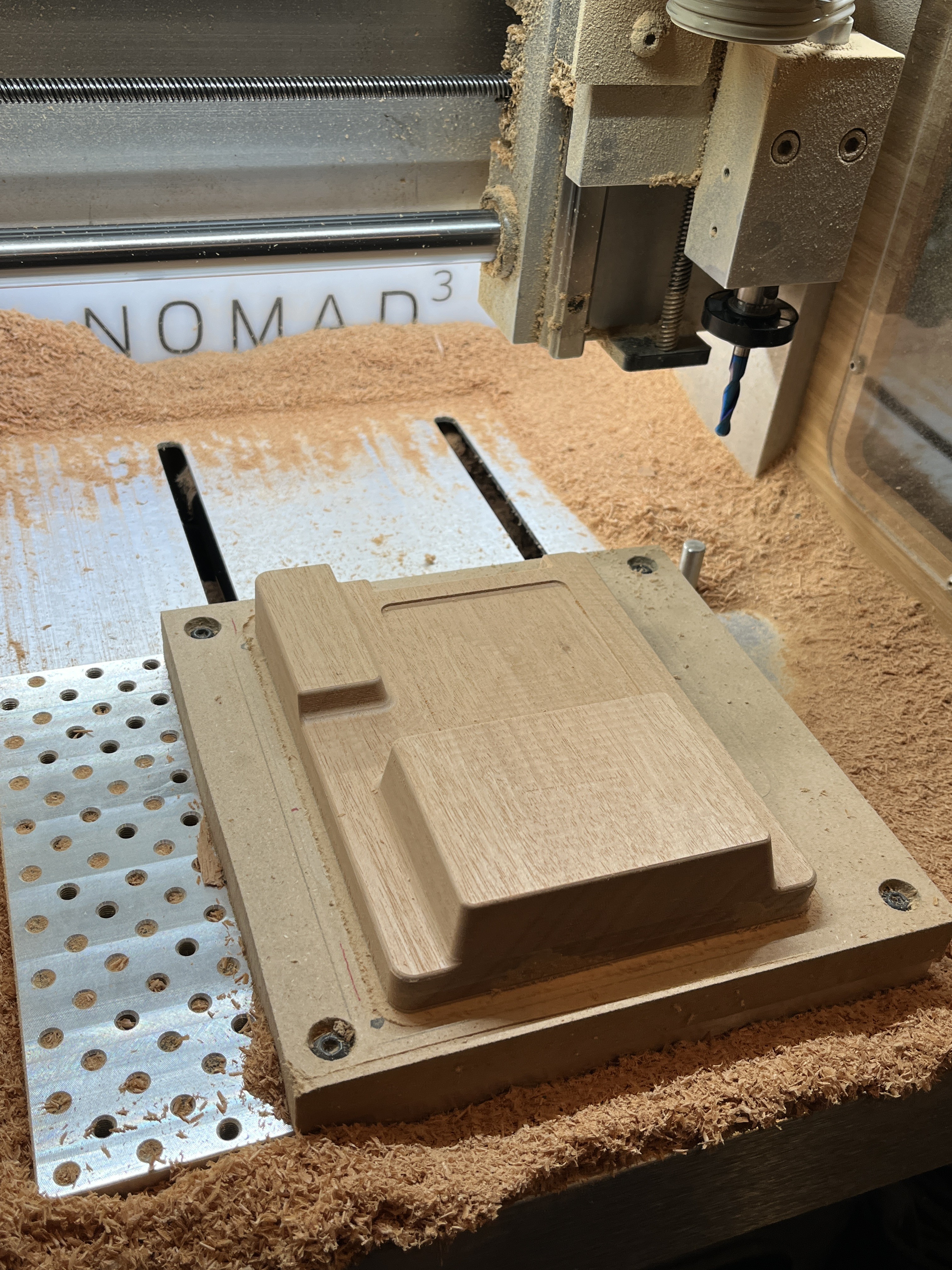 The Nomad 3 by Carbide 3D was awesome as always on this project. Machining the wood back was done with a single-flute Datron 5mm cutter, working much better than the 0.25” compression endmill that I tried. Some cheap Amazon 1/32” endmills were used to cut the slots in the bronze heatsink and keypad, and a 15 degree vee bit was used to engrave the Gravotech keypad labels.