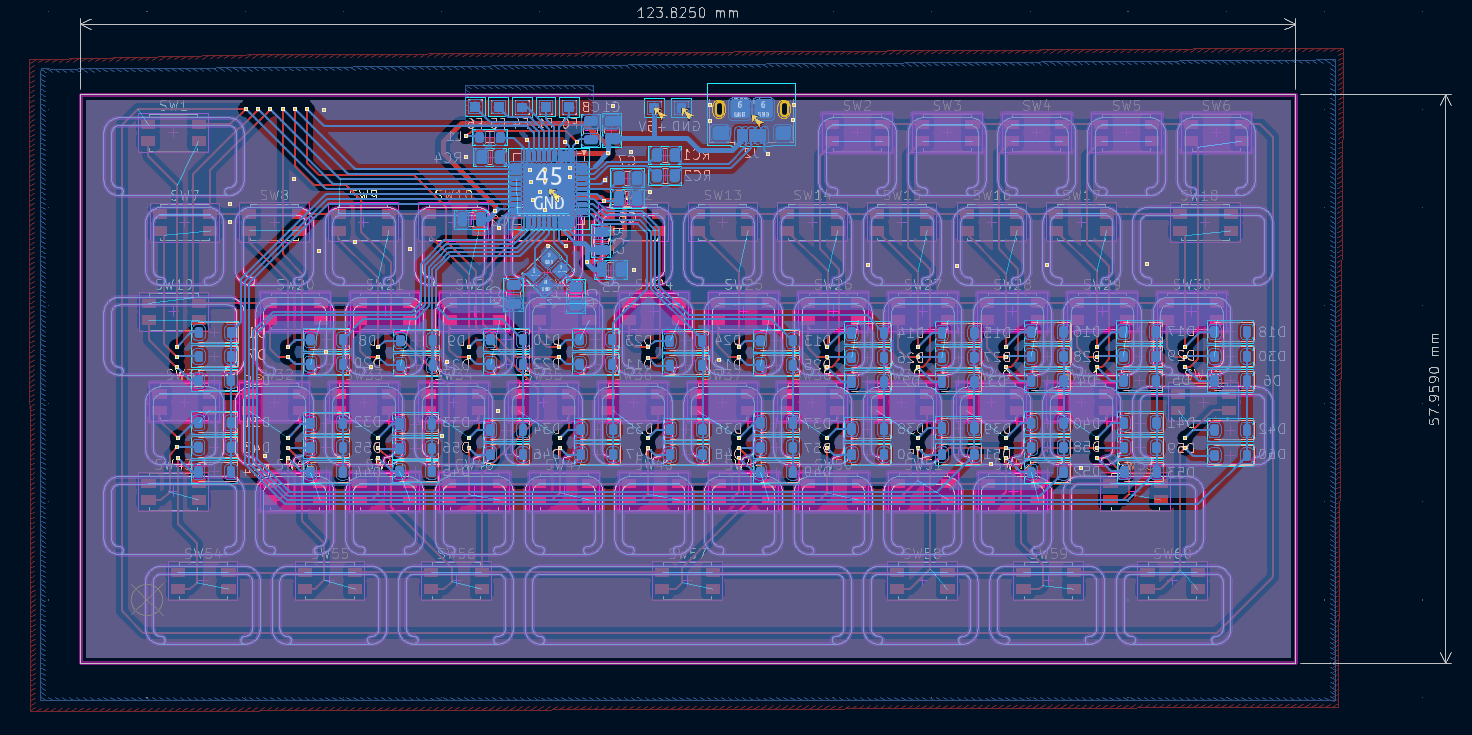 After finding a satisfactory combination, a .dxf sketch of the full keypad was imported into KiCAD and used as a guide for laying out PCB components. I placed the PCBWay order (with assembly to avoid biting off too much) and began refining the internal layout of the assembly.