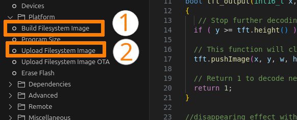 The pictures are stored in a separate flash partition. Select Build Filesystem Image and Upload Filesystem Image in the PlatformIO tab. This process will take some time, depending on the size of your files.