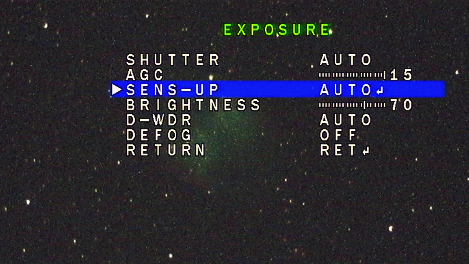 Instead of a computer with long exposure astro-camera, this project takes advantage of a high-sensitivity analog video camera with a built-in Starlight / Sens-Up mode. This feature extends the exposure time up to ~1.2 seconds (1/25s × 30 boost) with high gain, making faint details visible directly in the video signal: