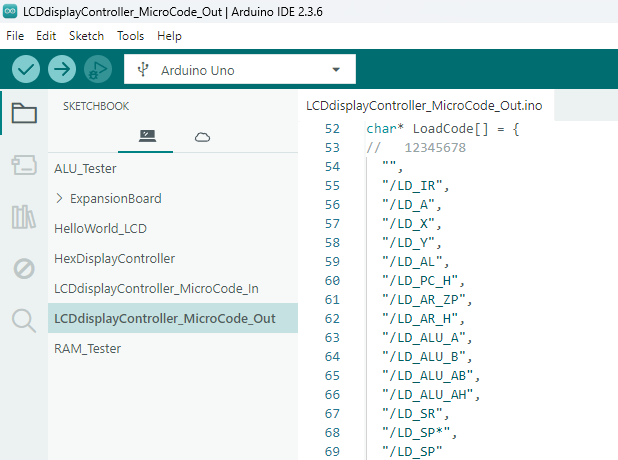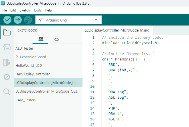Similar to the HexDisplayController,, the processor code is written in the Arduino IDE, then programmed onto the UNO R3 board. The processor is then removed from the UNO board and plugged into the LCD board. Here is a screenshot of the MicroCode_In version containing the 6502 instruction strings.