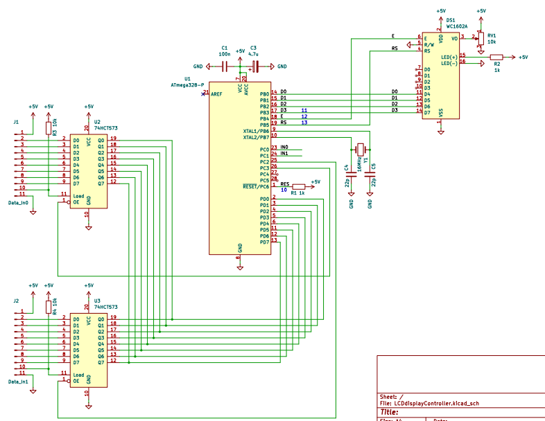 The LCD module is connected via 4-bit data bus as in the example codes for the Arduino. Then it only needs the resistor for the back light and a potentiometer for the contrast.