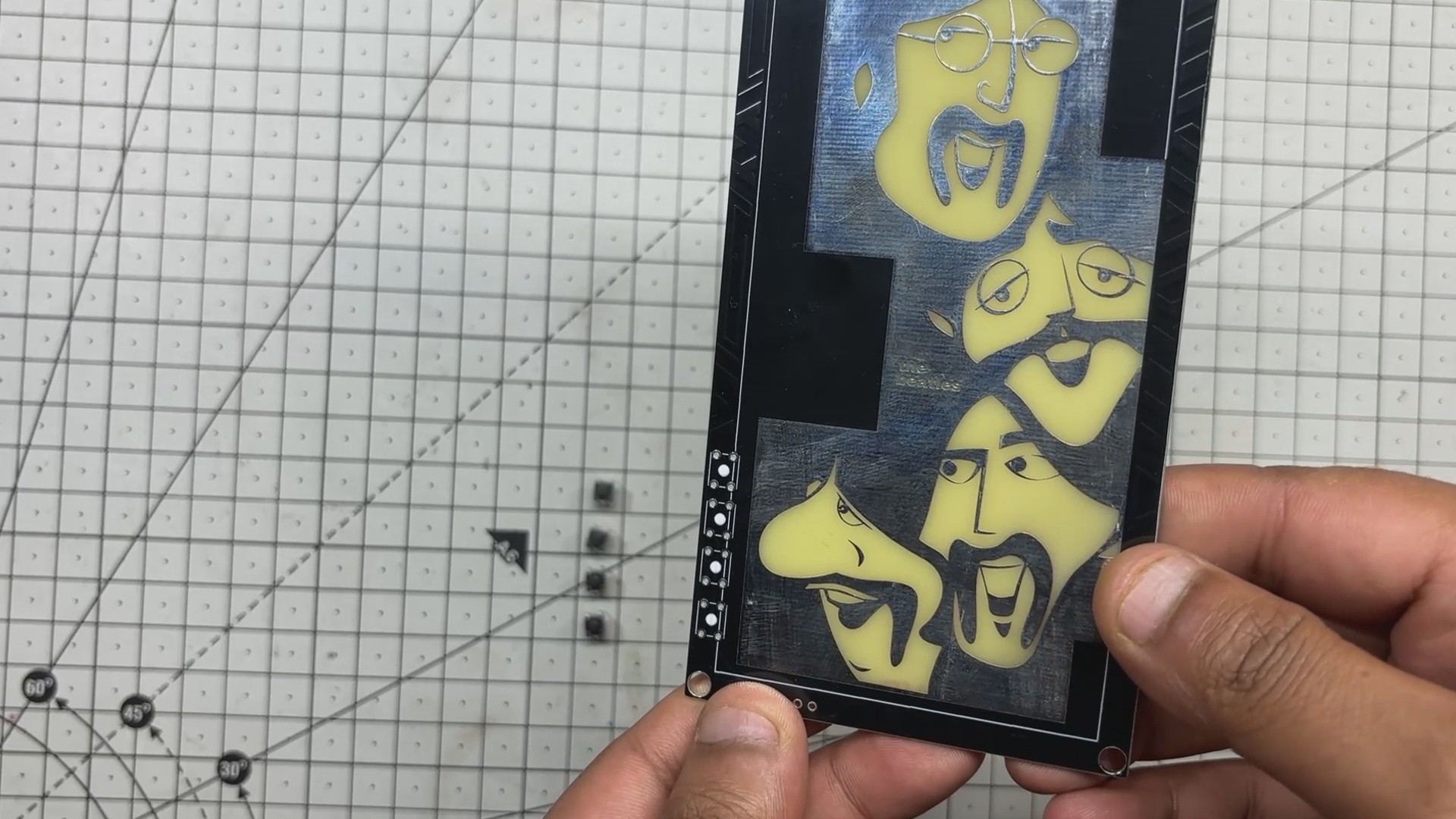 For the Beatles-inspired art board, my approach was simple but intentional. I searched for a cartoon-style design of the original Beatles that I could replicate on a PCB. Then I used solder mask openings on both the top and bottom layers to control how light passes through. RGB LEDs mounted on the lower PCB shine upward, illuminating the artwork from behind. The result is a glowing tribute where electronics and illustration merge into one expressive piece.