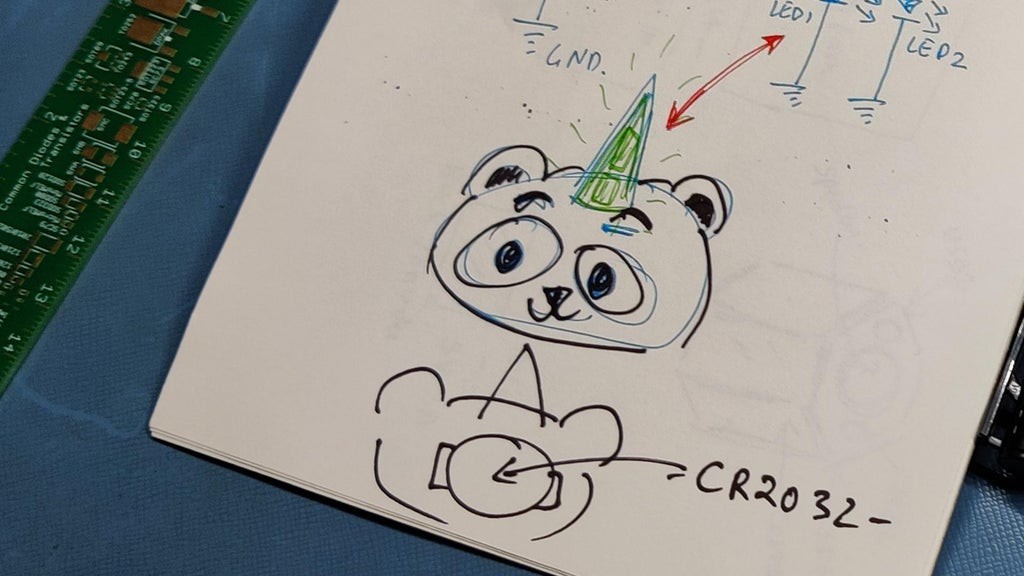 Next came Pandacorn, which was a panda with a unicorn horn. I placed all the SMD components and LEDs on the bottom side of the board and designed the panda illustration on the top. The horn area had the solder mask removed from both layers, allowing light from the flipped LEDs to shine directly through the board. I first saw this clever trick in a Hackaday SAO badge, and it opened up a whole new way of thinking about PCB layering.