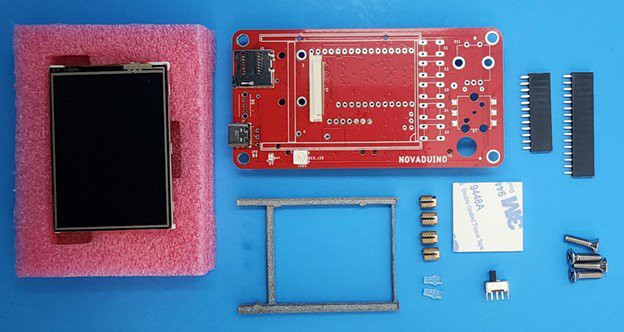 The Feather processor plugs into the back of the Novaduino Display PCB after soldering the headers. The Novaduino PCB comes with a color resistive touch 2.4" display, 3 tact switches, and one rotary encoder as well as an enable switch. The Novaduino Display KIT001 can be purchased on Tindie.