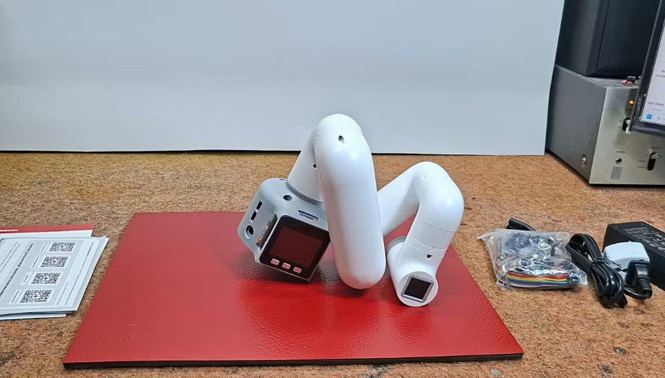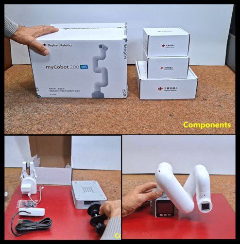 Today I received a package containing the few Elephant Robotics products. The shipment is well packaged and fully protected from mechanical impacts during transport. The package contains the myCobot 280 M5 robot arm, myCobot Camera Flange 2.0 and myCobot Adaptive Gripper. There is also a G-shape Base 2.0 which serves to attach the robot arm to the base.