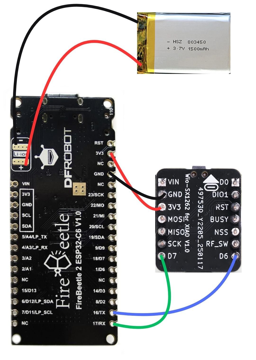 The circuit consists of mounting the SX1262 shield onto the Xiao nRF52840, then wiring jumper connections for 3V3 and GND. Connect FireBeetle pin 17 to Xiao pin 7, and FireBeetle pin 16 to Xiao pin 6. It’s a good idea to remove the plastic housings from the jumper cable tips and lightly crimp the connectors going into the SX1262, since the headers are very thin and jumper cables often fit poorly. LCD screen is connected using a GDI cable, so no worries about pins.