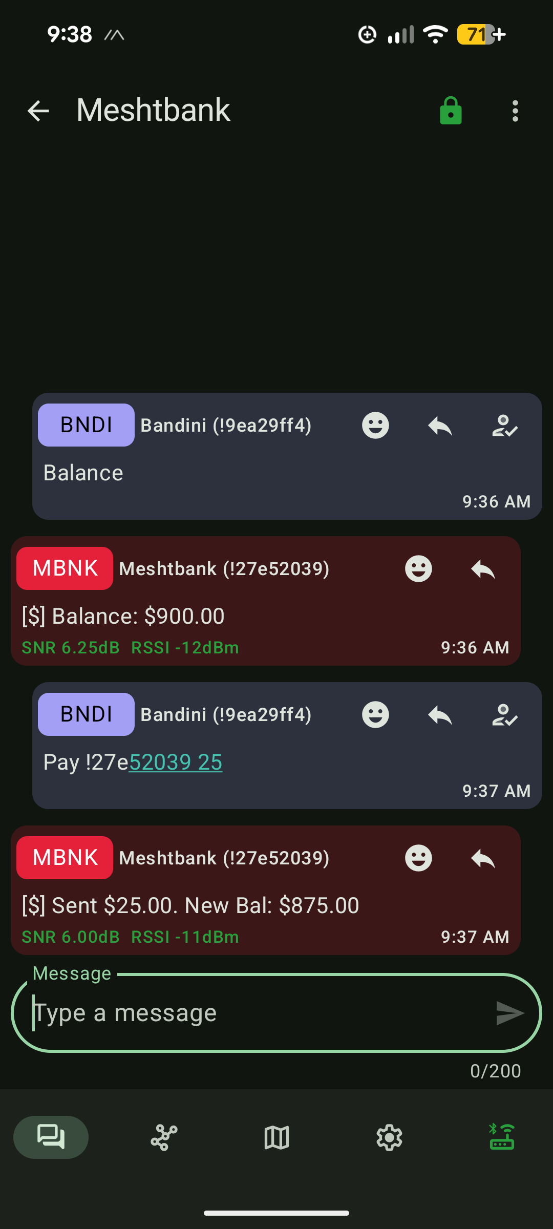 Meshtbank is an early, experimental project intended to explore what Meshtastic could offer as a foundational network layer for replicating applications that might be essential in scenarios without Internet or grid power.