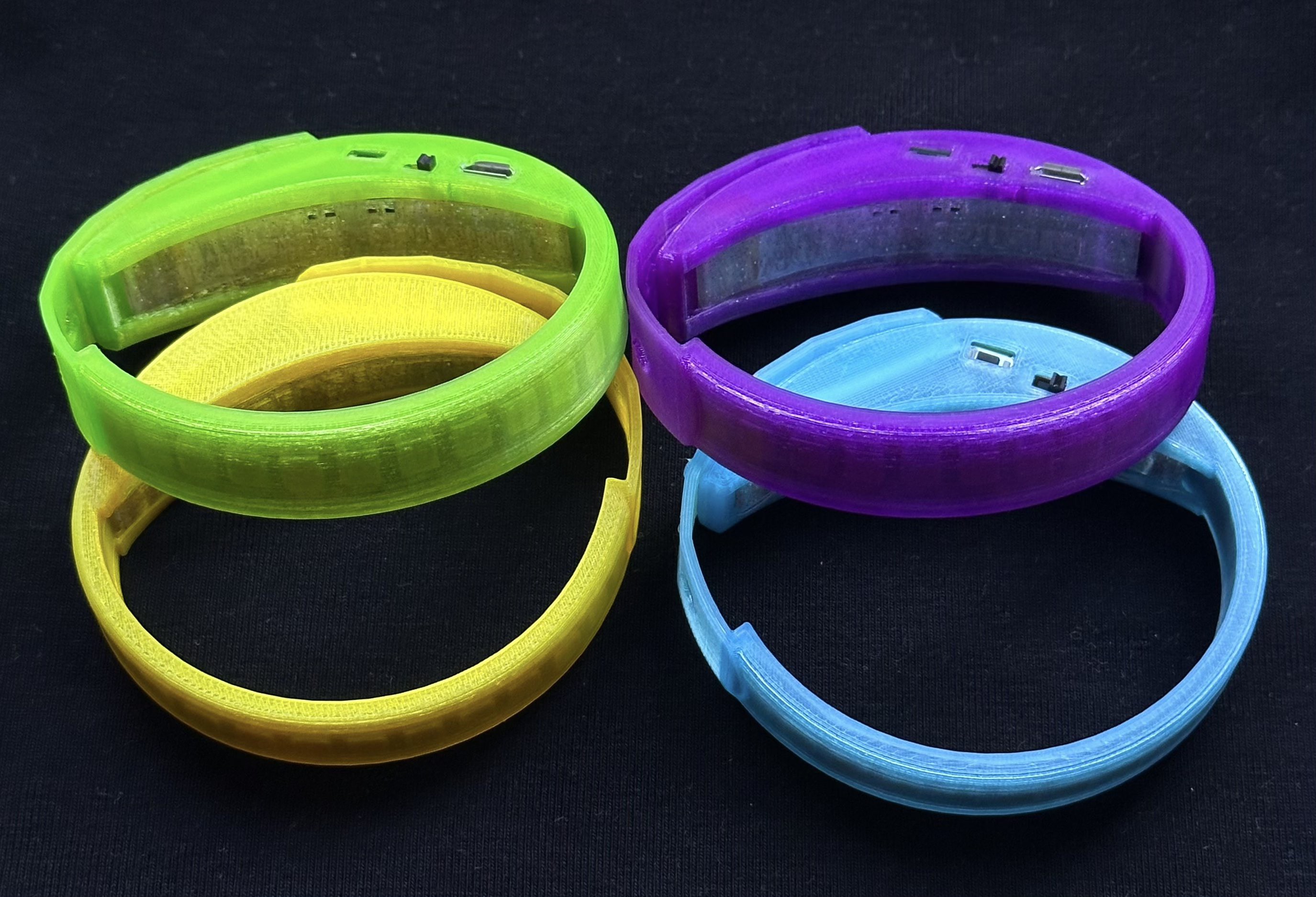 I found this great new filament "EONO 3D Print Glow in the Dark TPU" and I could use the same settings I used for the "SainSmart white". They look even better as this filament is see-thru which makes the LED even brighter. The 4 colors of the wristbands are super vibrant in UV light.