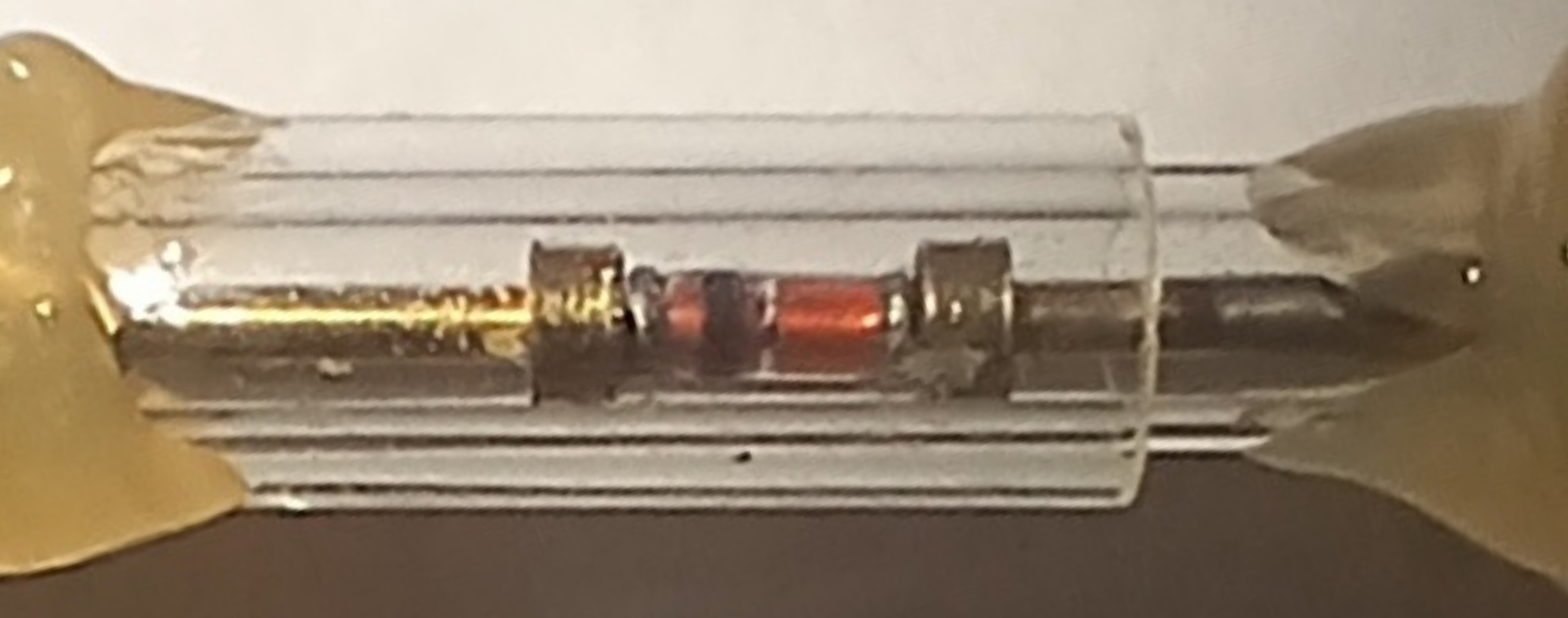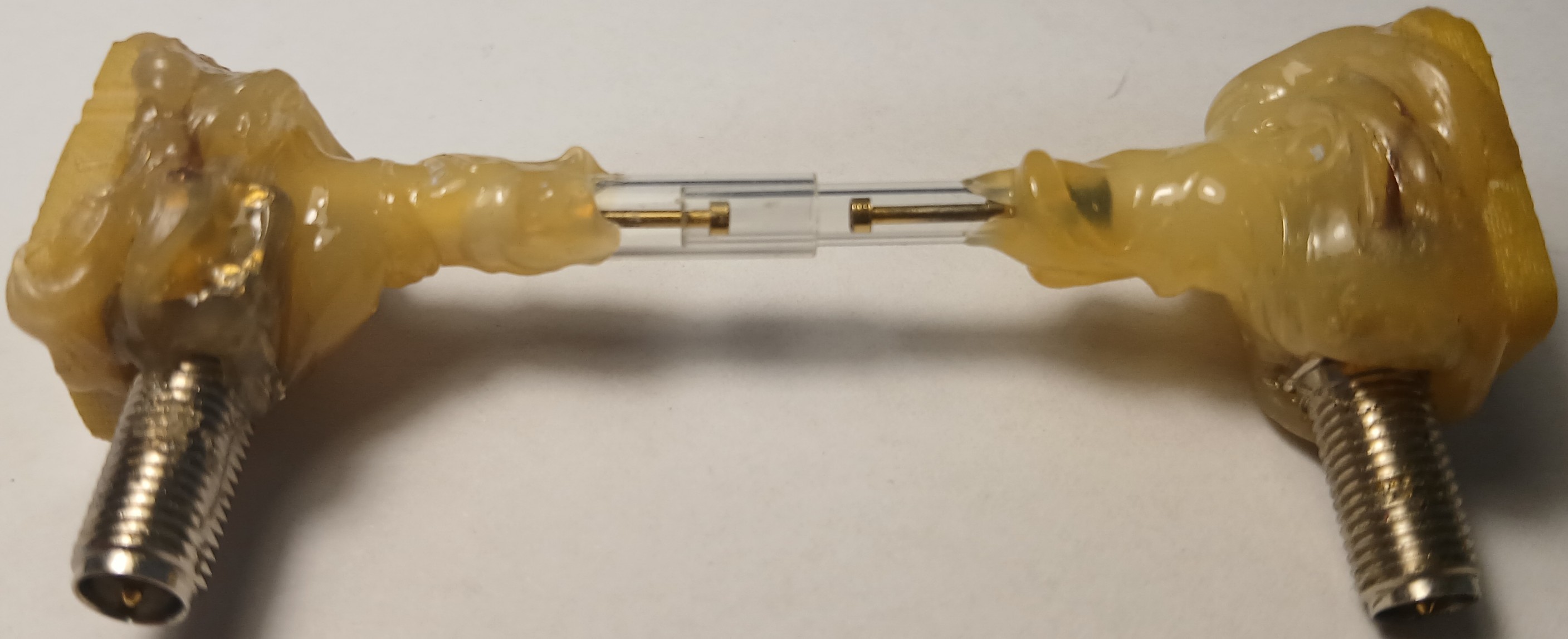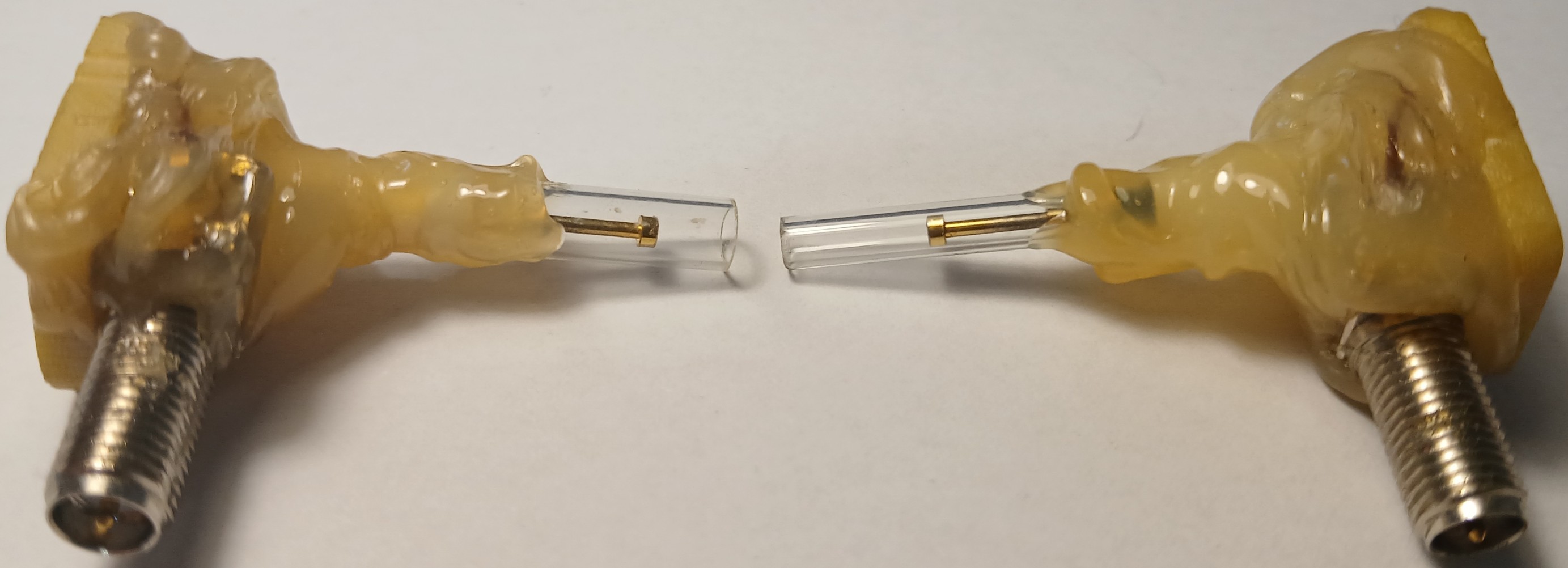 I made a jig for easily measuring Minimelf packages. The glass tubes were taken from incandescent light bulbs. I also used SMA connectors (male and female) and spring test probes. I attached the tubes to the SMA connector and the spring test probe using epoxy resin. I could have skipped the connectors and soldered the cables directly, but I was worried that the cable might break one day.
