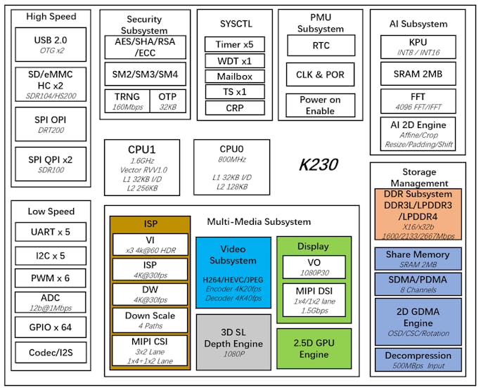 10/23/2023 at 04:52 • 0 commentsThe K230 chip is the latest generation SoC product in Canaan Technology's (NASDAQ: CAN) Kendryte® series of AIOT chips. The chip adopts a brand-new multi-heterogeneous unit acceleration computing architecture, integrates two RISC-V C908 computing cores, and has a built-in new generation KPU (Knowledge Process Unit) intelligent computing unit. Multi-precision AI computing power with INT8 and INT16. Supports general AI computing framework. The chip also has a variety of peripheral interfaces, as well as multiple scalar, vector, graphics, and other dedicated hardware acceleration units such as image 2D engine, AI 2D engine, 2.5D GPU, and 3D depth engine. K230 provides full-process computing acceleration for various computing tasks such as images, videos, audio, AI, etc. The chip has many features such as low latency, high performance, low power consumption, fast startup, and high security. K230 can be used in various smart hardware products, such as smart door locks, home smart security cameras, dictionary pens, payment recognition, 3D structured light vision modules, drones, interactive robots, smart home appliances, smart toys, and smart manufacturing, intelligent vehicle cockpit and many other fields.