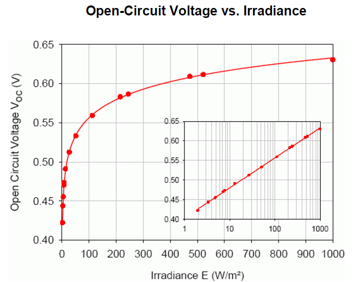 At very low light levels (20W/m2) Voc already exceeds 0.5V per cell.