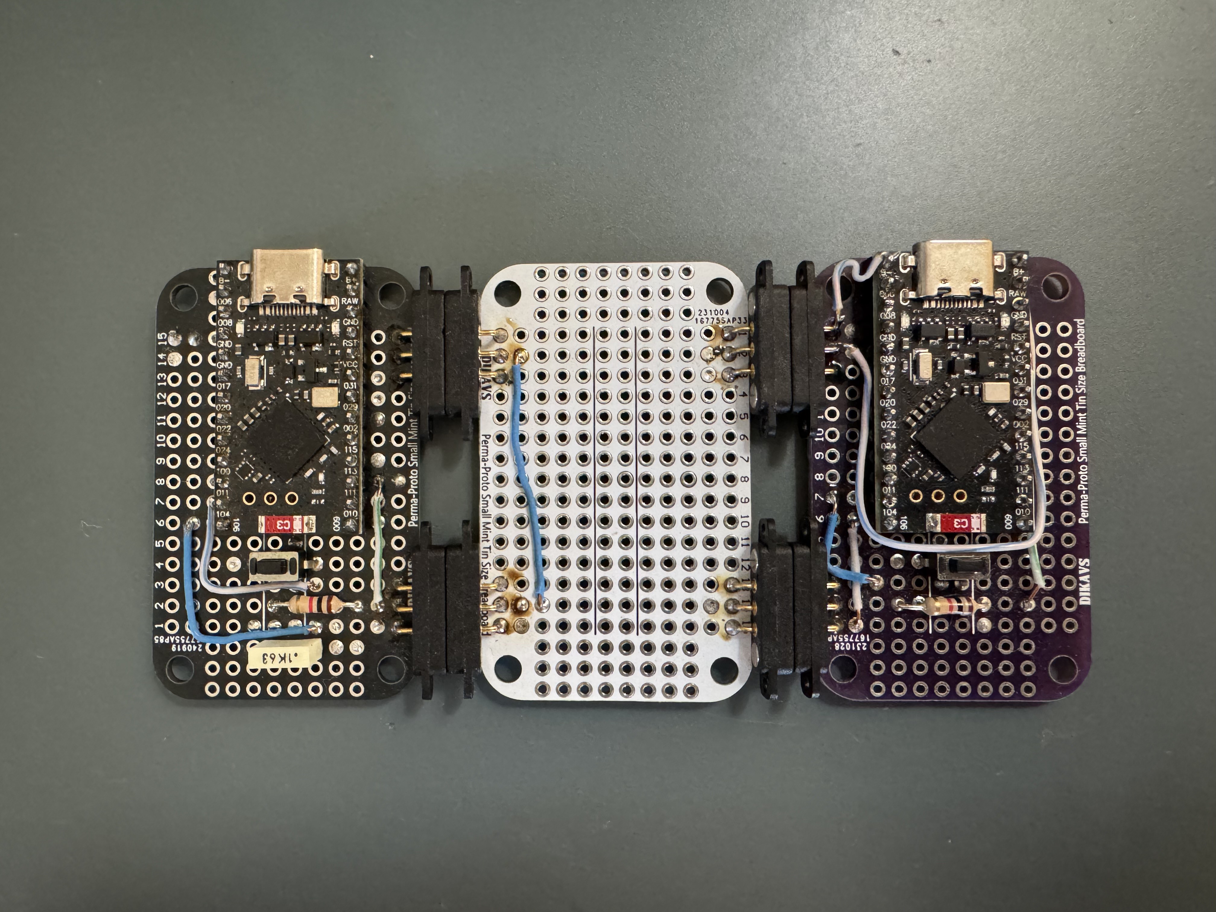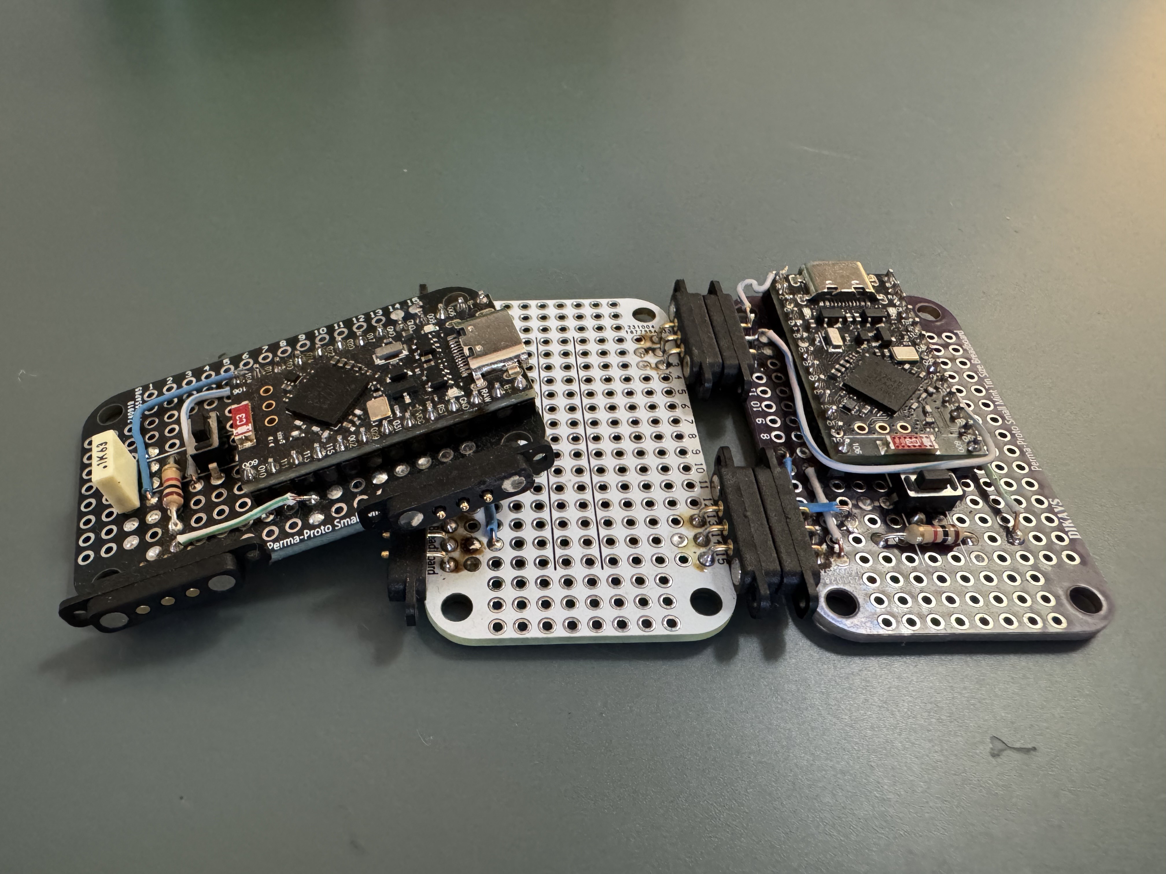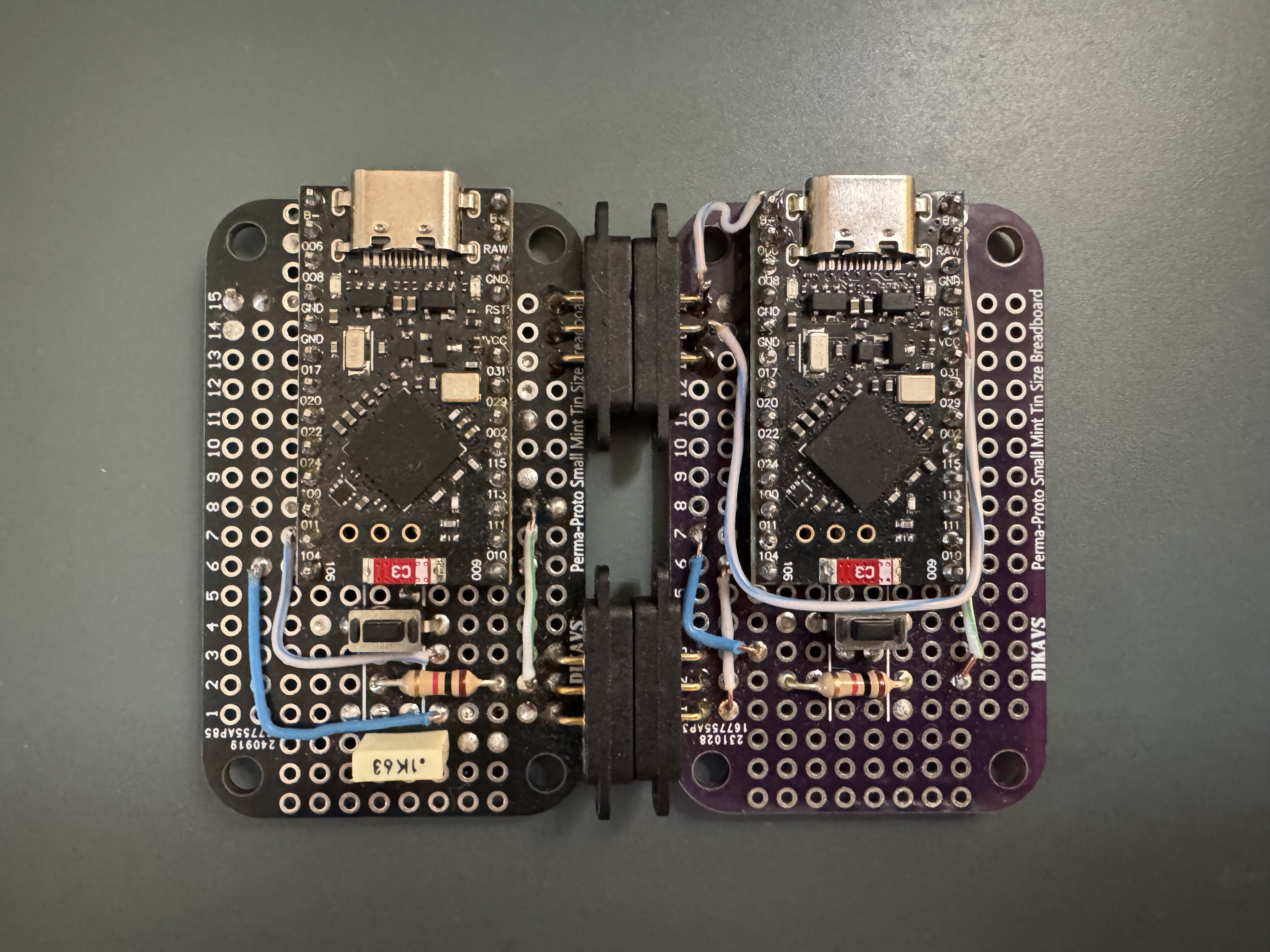 It’s built around two Nice!Nano v2 boards acting as origin and terminal nodes, mounted on proto boards and connected through magnetic edge connectors.